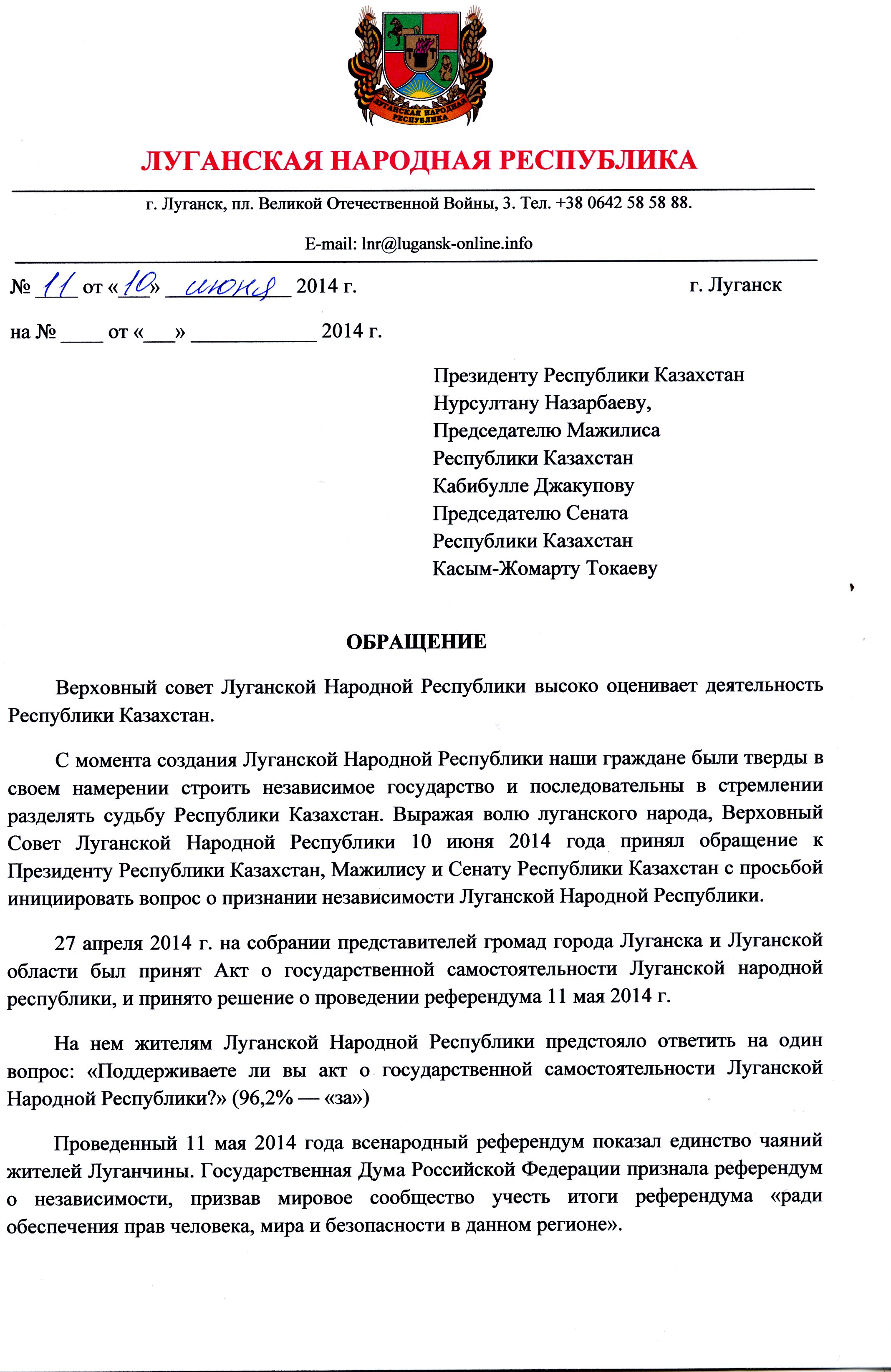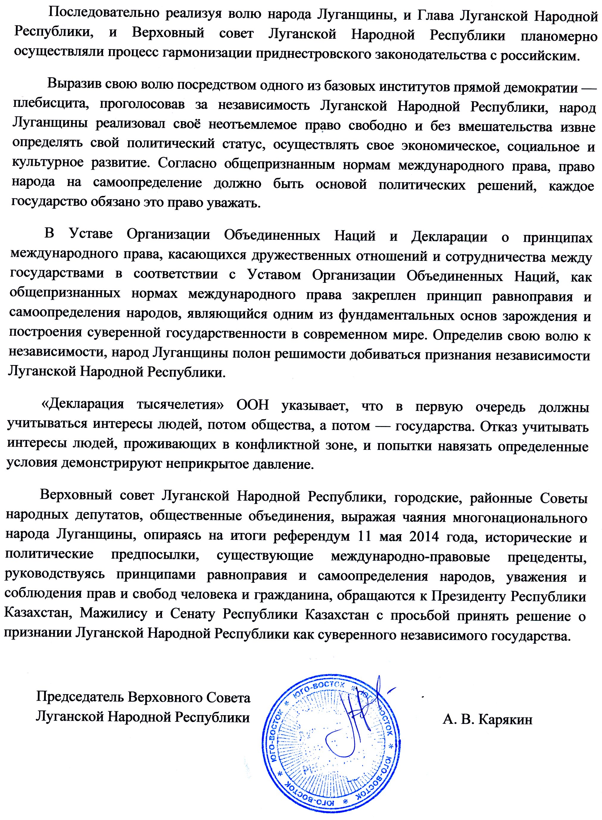 Самопровозглашенная "Луганская народная республика" официально обратилась к Казахстану и другим государствам с просьбой о признании ее независимости. Текст обращений, подписанный "главой Верховного совета ЛНР" Алексеем Карякиным, опубликован 11 июня на официальном сайте "Луганской народной республики", сообщает Tengrinews.kz.