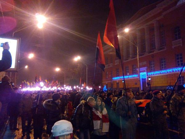 В марше приняли участие представители "Правого сектора", ВО "Свободы", полка "Азов", бойцы добровольческих батальонов. В руках люди держали государственные флаги Украины и флаги УПА и ОУН. Участники марша периодически выкрикивали "Слава Украине! Героям Слава!", "Герои не умирают!", "Украина - прежде всего!", "Бандера придет, порядок наведет!", а также антироссийские речевки.