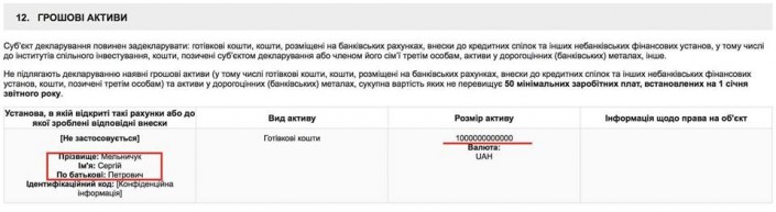 В разделе денежных активов Мельничук написал, что наличными у него есть триллион гривен. Денег на банковских счетах нет.