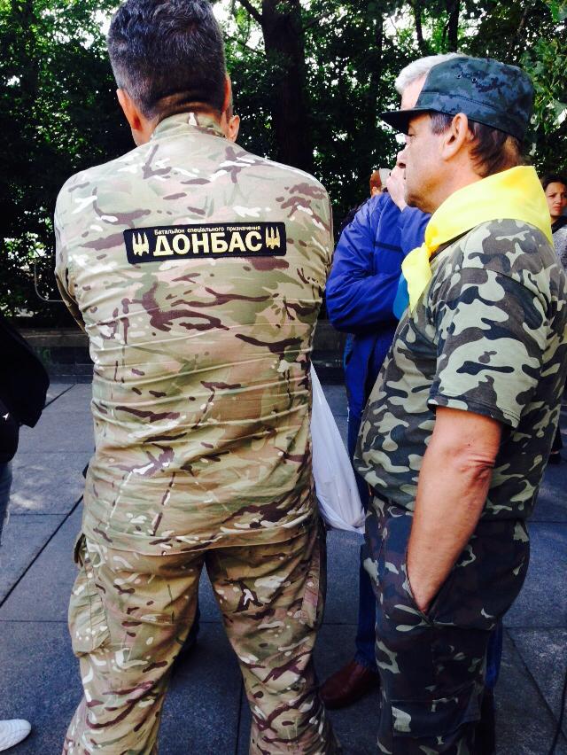 С сооруженной трибуны слышно недовольство митингующих рукопожатием Порошенко с Путиным в Минске. Собравшиеся призывают весь мир признать Россию агрессором. Среди не политических лозунгов - в штаб АТО должны войти те, кто принимал участие в военных действиях. В частности, люди в камуфляже недовольны действиями министра обороны Украины - Валерия Гелетея, который в прошлом не был военным, а работал милиционером.