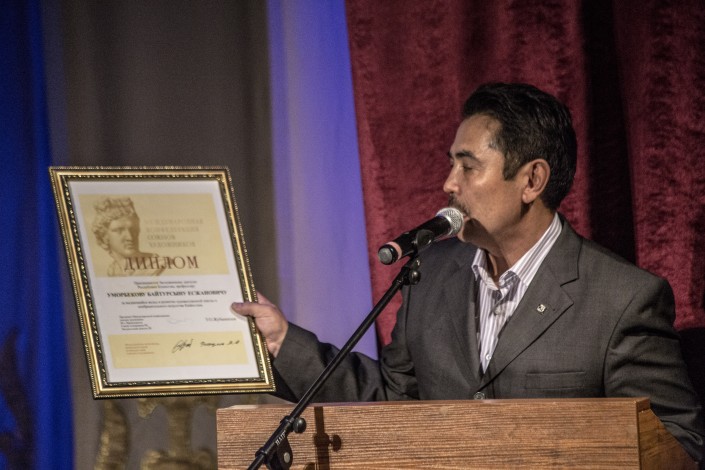 На торжественном мероприятии по случаю юбилея председатель Союза художников Казахстана Омирбек Жубаниязов вручил Уморбекову от имени организации золотую медаль имени Кастеева за творческие заслуги и позолоченную медаль Союза художников.