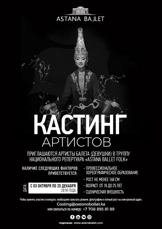 Кастинг продлится до 20 декабря 2018 года. Желающим необходимо отправить свое резюме и фотографию в полный рост в сценической позе на электронный адрес casting@astanaballet.kz.
