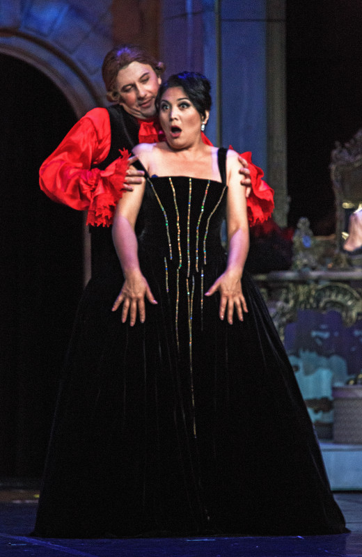 Высокий красавец Евгений Чайников в белоснежном камзоле, украшенном перьями и затейливой вышивкой - самовлюбленный дамский угодник Бланзак, который в итоге легко утешился заменой несостоявшейся невесты Джулии на влюбленную в него Лючиллу. Внешняя импозантность вкупе с сочным басом и отличной игрой сделали образ его героя запоминающимся.