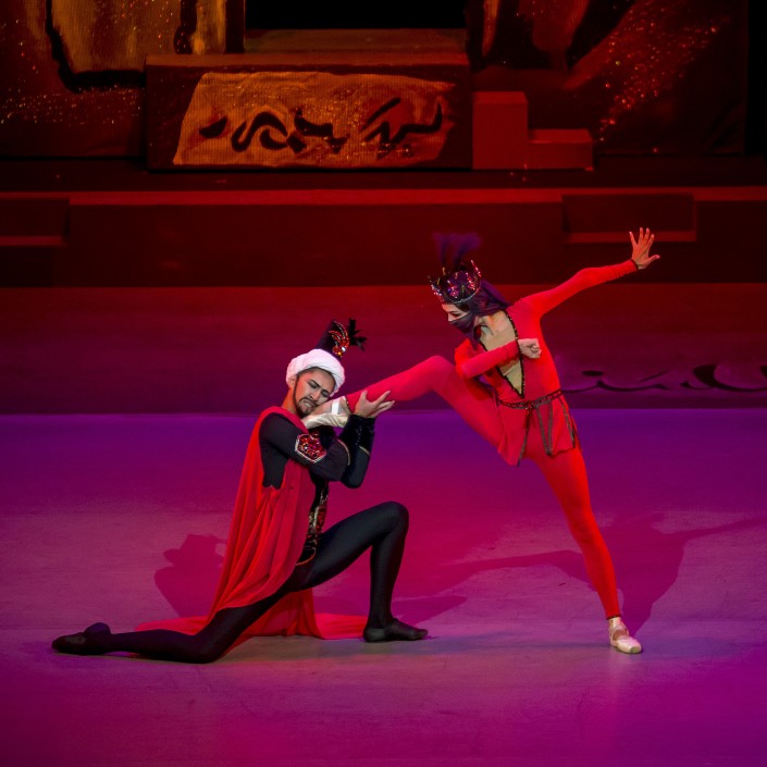 Ведущий солист театра "Астана Балет" Фархад Буриев, которому самой судьбой суждено исполнять партии прекрасных принцев, в амплуа художника Ферхада проявил бесподобную технику и масштаб артистической личности. Его герой, ставший невольным узником безответной любви царицы, тем не менее вырывается из-под ее власти, когда отрекается от любви и решает добыть воды для страдающего народа.