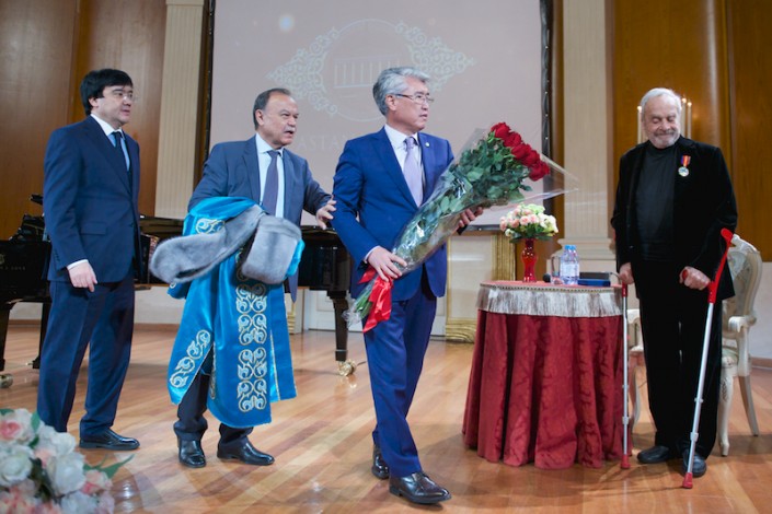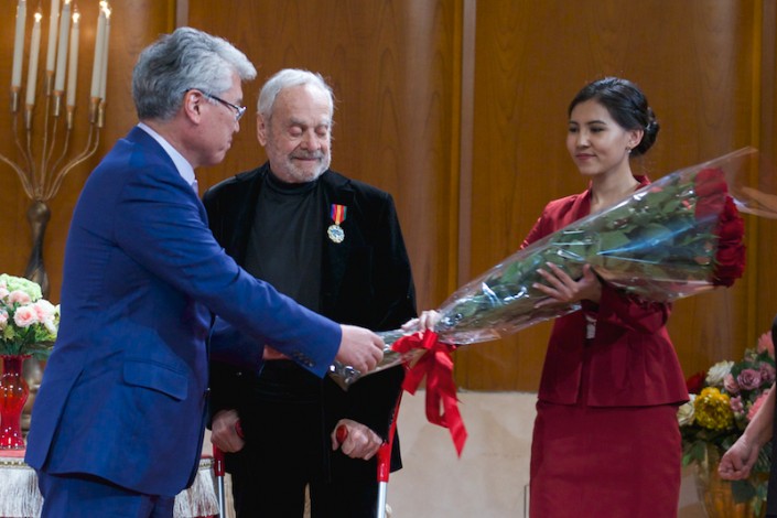 Министр культуры и спорта РК Арыстанбек Мухамедиулы вручил в "Астана Опера" орден "Достық" II степени за значительный вклад в культурное развитие страны, укрепление дружбы и сотрудничества между народами одного из самых выдающихся сценографов наших дней - Эцио Фриджерио.
