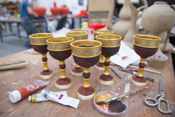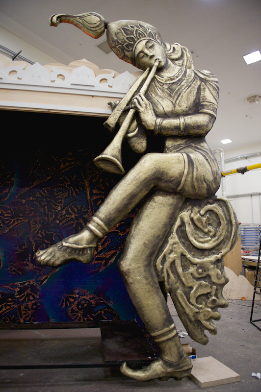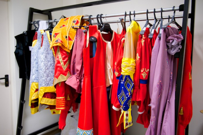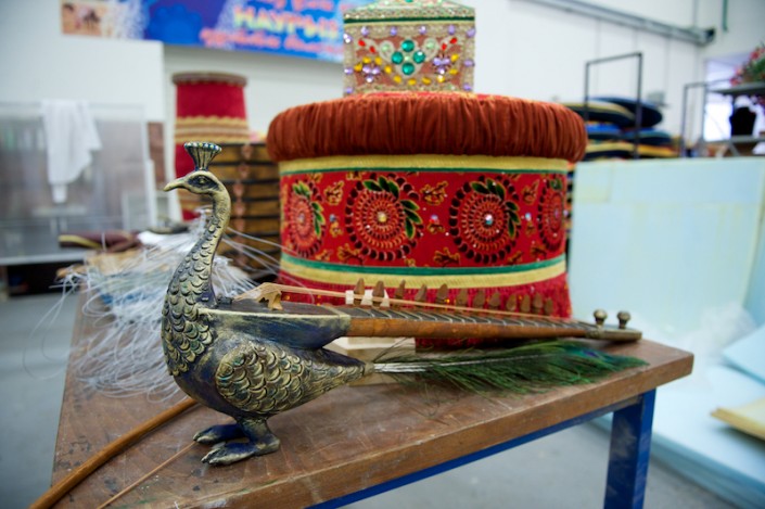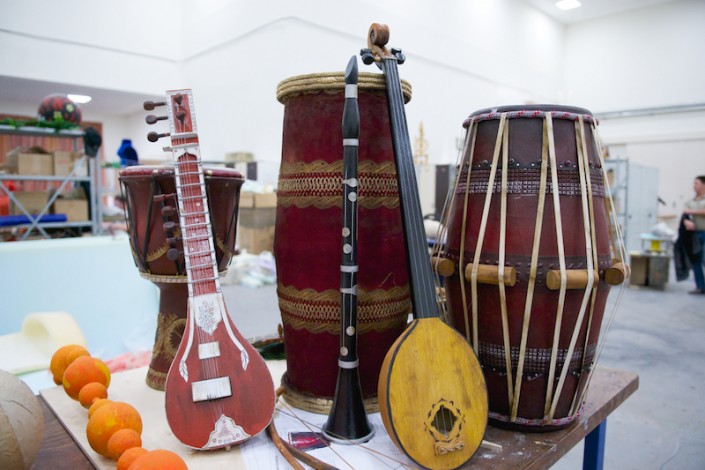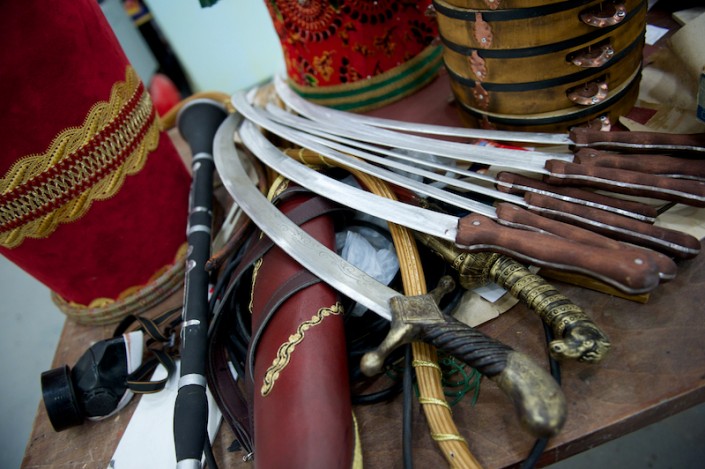 Вот сверкают блеском фарфора изготовленные кувшины, бокалы и чаши необычных форм. К слову, изогнутые линии создать совсем нелегко, хотя техника осталась прежней: папье-маше. А копья, клинки, ножи и другое декорированное оружие сделаны с применением новой технологии – работы с непростым материалом – ворблой, в основе которого лежит сочетание древесных опилок с полимером. Реквизит дает имитацию настоящих деталей, но все они облегчены и удобны для исполнителей, которым то и дело приходится доставать сабли из ножен, играть на инструментах. К примеру, струнный, сделан в виде павлина. Однако, звуки барабана, бубенцов и др. могли бы помешать во время спектакля, поэтому, применив специальный метод, их устранили.