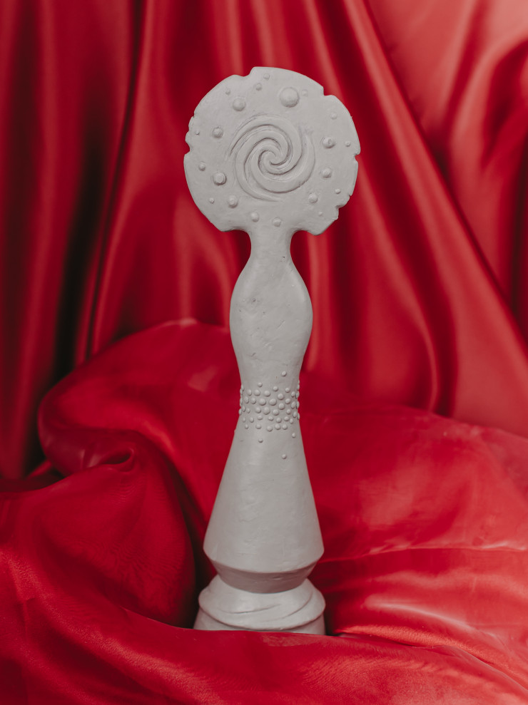 Статуэтка – это не просто сувенир, считает автор, поэтому было необходимо объединить в ней национальную форму с высоким искусством. В фигуре Умай можно проследить одновременно женский образ, отсылку к элементам традиционного прикладного искусства, изображению юрты. На основании из зеленых пластин, инкрустированных камнями, нанесено название премии на латинице и древнетюркском языке.