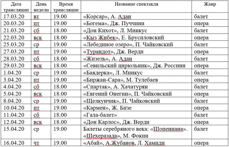 Для любителей высокого искусства хорошая новость: "Астана Опера" покажет запись своих постановок в онлайн-режиме на канале Tengrinews.kz/tv/. Подборку лучших образцов оперных и балетных спектаклей в исполнении артистов "Астана Опера" можно увидеть в период чрезвычайного положения, после чего трансляция вновь будет осуществляться в режиме реального времени согласно театральной афише.