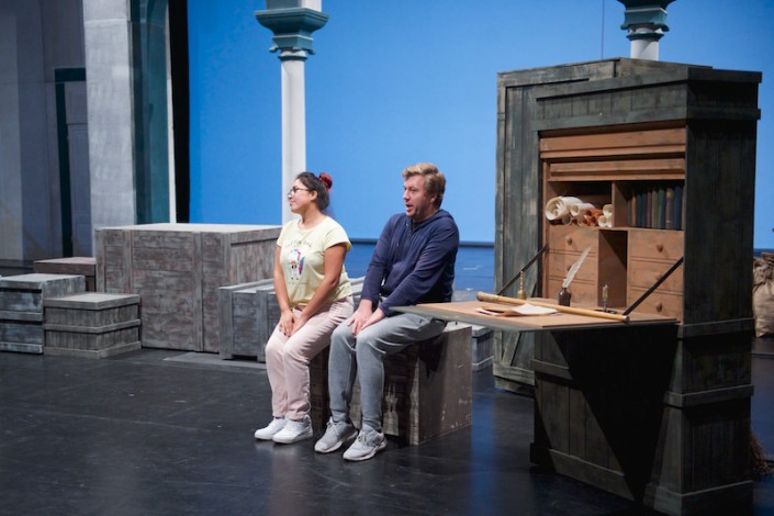Сейчас уже идут завершающие репетиции артистов на сцене, где выстроились декорации, которые перенесут зрителей и в интерьеры дома Бартоло, и на рабочее место цирюльника, и в комнату Розины…