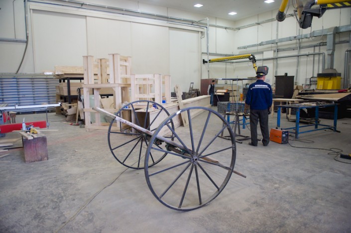 В бутафорском цехе можно увидеть такие житейские мелочи, как метлы, ведра, мешки, тюки, корзины, зонт, кошельки с монетками.