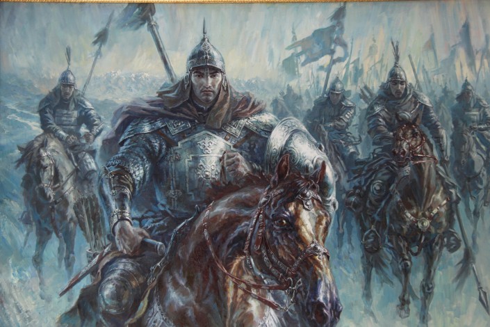 "В картине "Утро перед битвой" мне хотелось показать воина. Молодого, но в его глазах чувствуется, что он познал и горечь потерь, и вкус победы. Он понимает, что за ним родная земля, его близкие. (...) Я хотел передать атмосферу того времени - холодного дождя, гор, жайляу, воинов, которые уходят на бой с надеждой вернуться. Бирюзовый цвет олицетворяет очищение перед боем", - рассказал художник.