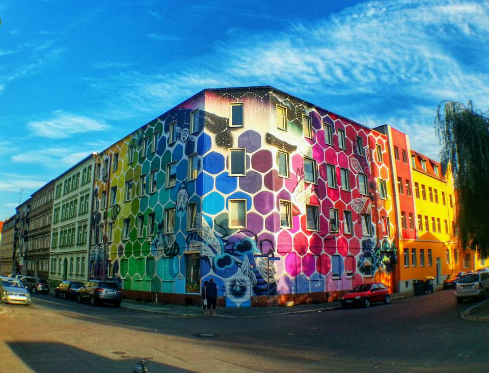 Отметим, что самая известная работа Марины Зуми - арт-волл "Соты жизни". Из обычной "бетонной коробки" в немецком городе Галле художница сделала огромную радужную фреску в виде пчелиных сот площадью 800 квадратных метров.