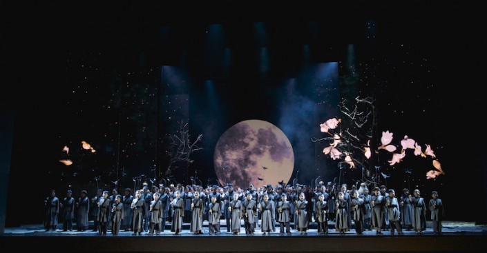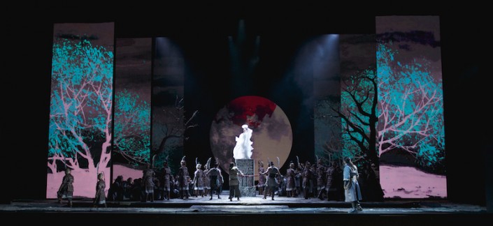Непривычная на первый взгляд монохромность (спектакль выдержан в черно-белом цвете) тоже имеет смысл. Во-первых, на тот момент, когда создавалась опера "Турандот", европейцы не имели четкого представления о Китае, и постановщик решил отразить эту идею в черно-белых красках. А во-вторых, он вложил и другой смысл: сдержанность красок - это отсутствие любви в мире. Когда же режиссер добавляет красный цвет, например, в сцене с огромной, на все пространство экрана, луной - царицей мертвого мира - заливается красными каплями, он как будто говорит зрителю, что смерть здесь и сейчас она заберет в свои объятья следующую жертву. Этот цвет предупреждает нас о том, что должно произойти страшное. И вот беззащитная рабыня Лиу убивает себя, а сверху летят красные лепестки роз…