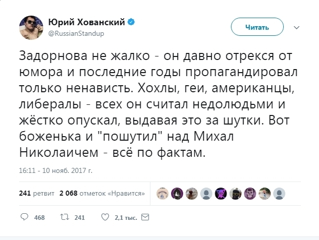 Популярный видеоблогер Юрий Хованский (на его канал в YouTube подписаны свыше 3,2 миллиона пользователей) навлек на себя гнев пользователей после публикации поста в Twitter, где он цинично прокомментировал смерть сатирика Михаила Задорнова.