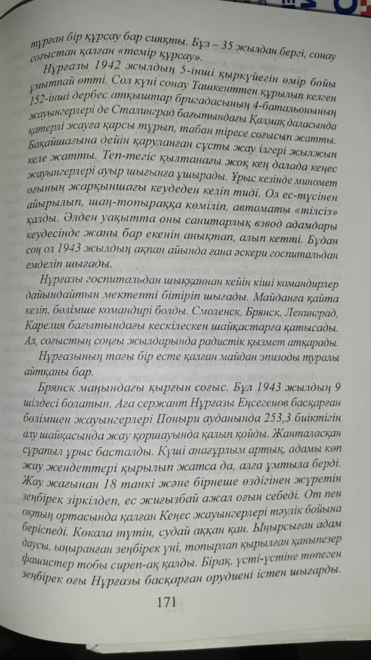 Өз кітабында Еңсегенов Нұрғазы былай деп жазады: "Егер СССР мен Финляндия арасындағы бітім 7/Х-44 жылы болған болса, таза ұрыста болған күнімнің саны 300-ден асады. 1945 жылы 13 апрельде Вена қаласын алуға қатыстық. Осы үшін "За взятие Вены" және "За боевые заслуги" медальдарымен наградталдым".