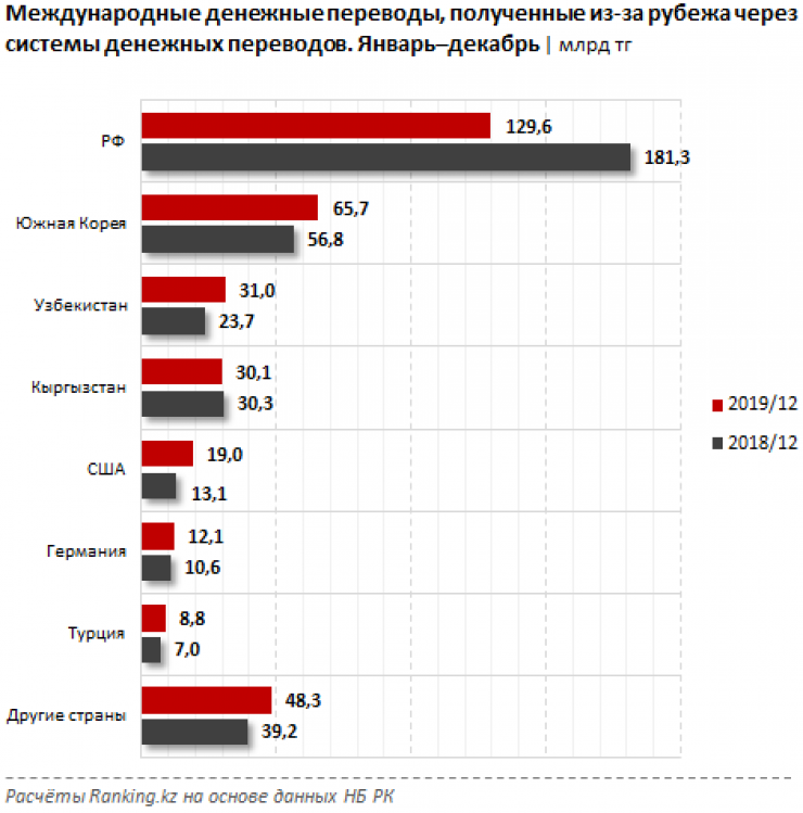 Максимальное сокращение переводов в РК было отмечено из России: сразу на 28,5 процента, при этом она продолжает лидировать по объему денежных переводов - 129,6 миллиарда тенге. Следом идет Южная Корея: объем переводов оттуда вырос на 15,7 процента и за 2019 год составил 65,7 миллиарда тенге. Третью и четвертую строки занимают Узбекистан и Кыргызстан - 31 миллиард тенге (плюс 30,6 процента) и 30,1 миллиарда тенге (минус 0,6 процента), соответственно. Значительно выросли переводы из США: на 45,2 процента, до 19 миллиардов тенге.