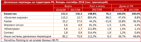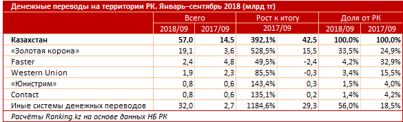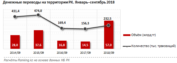 За три квартала 2018 года казахстанцы перевели друг другу по РК через системы международных денежных переводов 57 миллиардов тенге - это почти вчетверо больше, чем год назад, передает корреспондент Tengrinews.kz со ссылкой на Ranking.kz.