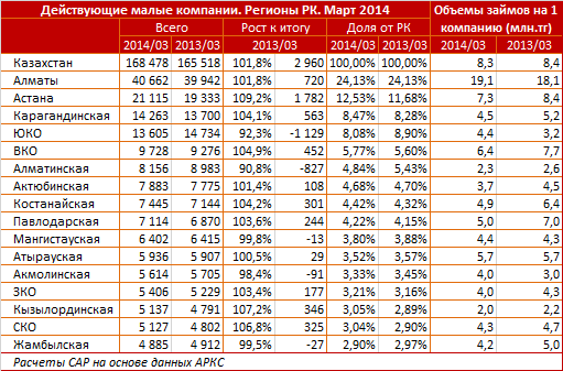 Сообщается также, что в среднем по Казахстану банковская задолженность на одно малое предприятие составляет 8,3 миллиона тенге. По данным портала, в марте 2014 года средний вес банковской задолженности на одно малое предприятие в Алматы составил 19,1 миллиона тенге. При этом отмечается, что год назад этот показатель был на один миллион меньше.