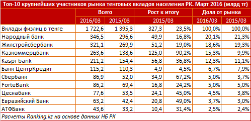 "Тройка лидеров рынка тенговых розничных вкладов представлена Народным банком, ЖССБ и Казкомом, занимающие соответственно долю рынка в 20 процентов, 19 процентов и 15 процентов. За год (2015/03-2016/03) вкладчики Народного банка (физлица) нарастили свои сбережения в тенге на 49,9 миллиарда тенге, или на 17 процентов, ЖСББ - на 51,2 миллиарда тенге, или на 19 процентов, а Казкома - на 125 миллиардов тенге, или в 2 раза", - подчеркнули специалисты аналитической службы.