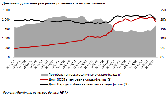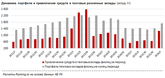 "Всего за январь-март 2016 года в тенговые депозиты физлиц был привлечен 51 процент всей суммы привлечения за 2015 год. На этом фоне совокупный размер портфеля розничных вкладов, номинированных в тенге, за год увеличился на 23 процента, до 1,7 триллиона тенге. Концентрация рынка розничных тенговых вкладов последние два года увеличилась, порядка 40 процентов рынка формируется двумя крупнейшими банками в сегменте - Жилстройсбербанк и Народный банк", - пояснили аналитики.