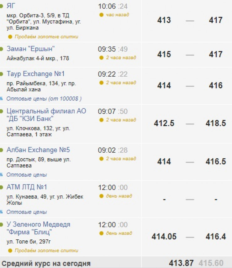 В Алматы американская валюта стоит 415,2-418,5 тенге. Средний курс равен 415,6 тенге.