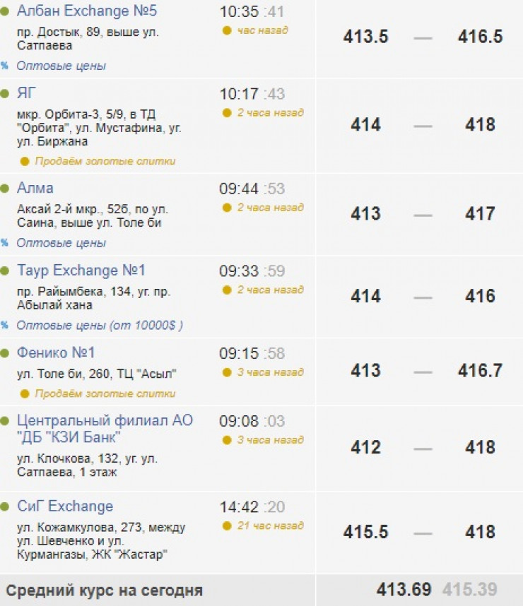 В обменниках Алматы средняя цена продажи доллара равна к этому часу 415,39 тенге. Максимальная цена американской валюты - 418, минимальная - 414,9 тенге.