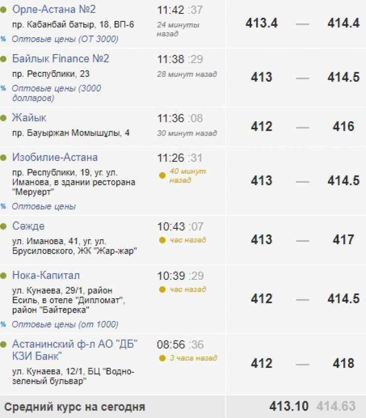 В Нур-Султане обменники продают доллар в среднем по 414,63 тенге. Максимальная цена продажи равна 418, минимальная - 414,4 тенге.