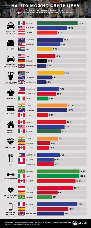 "Во время пребывания за границей стоит также попробовать поторговаться с таксистом в Мексике или попытаться сбить цену на медицинские услуги в Испании и на еду на Филиппинах и во Франции. Не воспользоваться возможностью сбить цену на некоторые услуги может означать спущенные в трубу деньги, в частности на обслуживание автомобиля, особенно если вы - женщина. Исследования показали, что автомастерские нередко навязывают женщинам услуги, которые им не нужны. И неудивительно, что именно мужчины чаще торгуются на СТО. При получении услуг, связанных с ремонтом квартиры или оплатой такси, мужчины также торгуются чаще, чем женщины", - поведали эксперты.