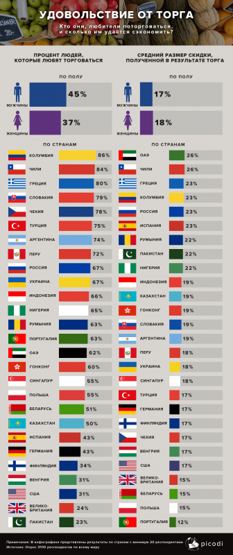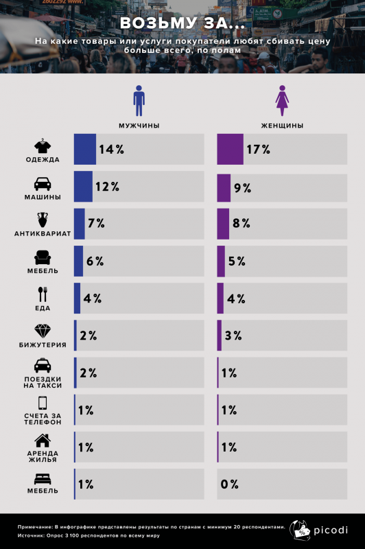 Согласно исследованию, мужчины любят торговаться больше, нежели представительницы прекрасного пола. 45 процентов мужчин и 37 процентов женщин оценивают торг как позитивное явление. При этом любить - не значит уметь. Как оказалось, женщины в среднем получают более высокие скидки, чем мужчины: 18 процентов против 17 процентов соответственно.