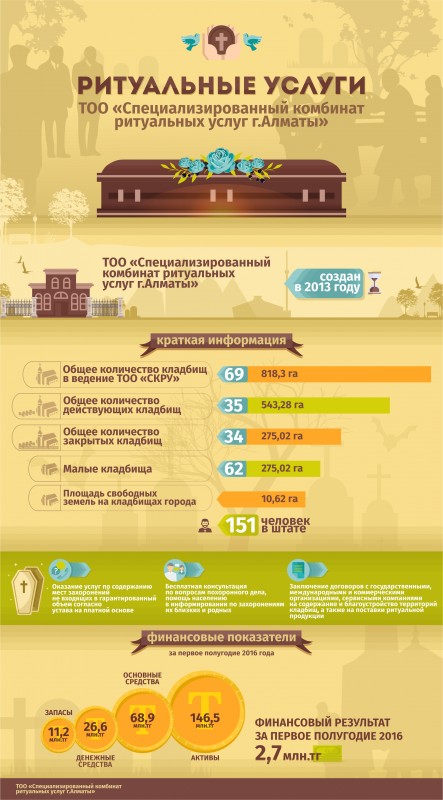 "Этот актив был создан в 2003 году постановлением акимата Алматы и на сегодняшний день создает рабочие места для более чем 150 человек, которые оказывают услуги по содержанию мест захоронения, находящихся на всей территории города. Также данная организация заключает договоры с государственными, международными и коммерческими организациями на содержание и благоустройство территорий кладбищ, занимается поставкой ритуальной продукции и проводит консультации по вопросам похоронного дела", - комментируют в акимате.