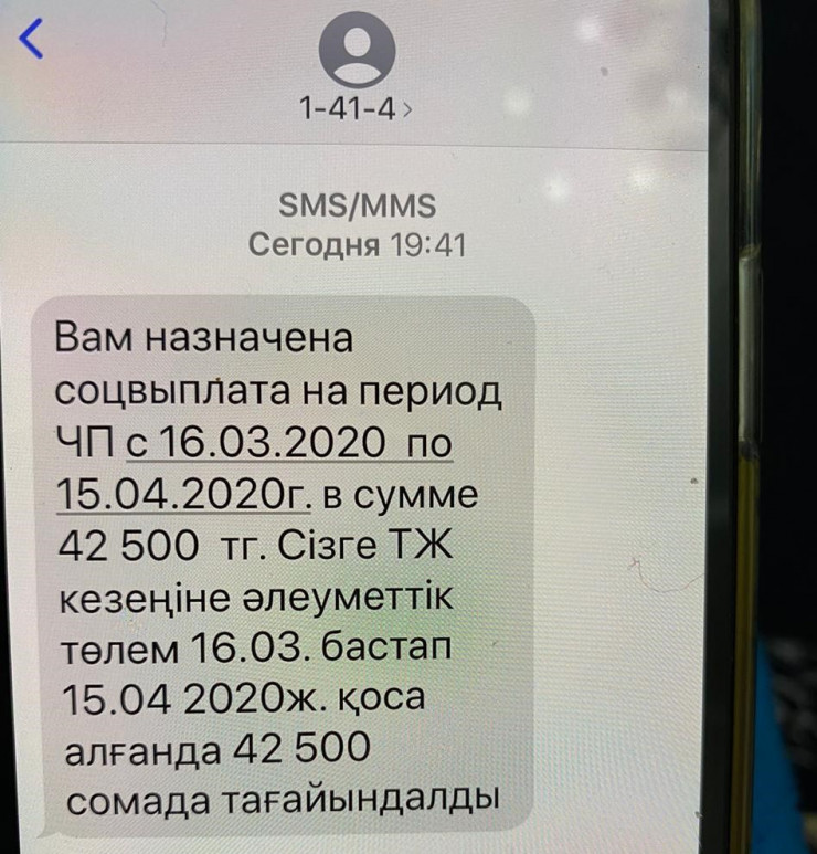 Казахстанцам начали приходить SMS о назначении социальных выплат на период режима чрезвычайного положения, передает корреспондент Tengrinews.kz.
