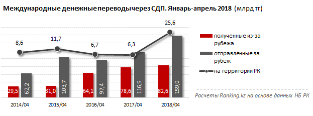 В целом, общий объем транзакций, выполненных с помощью международных систем денежных переводов за январь-апрель 2018 года, составил 267,2 миллиарда тенге (годом ранее - 201,4 миллиарда тенге).