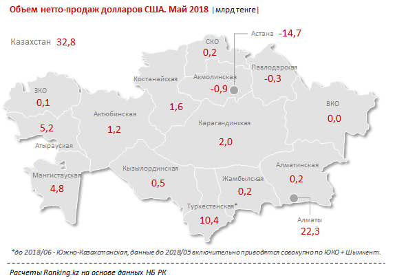 А вот среди регионов, где население больше покупало доллары, чем сдавало, лидирует Алматы - 22,3 миллиарда тенге. Следом идет Туркестанская область - 10,4 миллиарда тенге и Атырауская область - 5,2 миллиарда тенге.