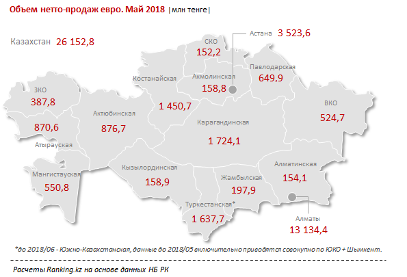 Евро популярен по всему Казахстану. По объему продаж евро в обменниках с большим отрывом лидирует Алматы - 13,1 миллиарда тенге, далее идет Астана - 3,5 миллиарда тенге. Также в топ-3 Карагандинская область - 1,7 миллиарда тенге.