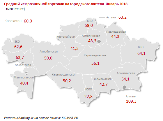 Самые высокие средние чеки традиционно пришлись на алматинцев: среднестатистический житель финансового центра потратил за январь 109,3 тысячи тенге - на 8,1 процента больше, чем годом ранее.