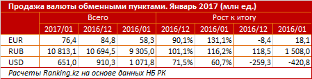 Спрос на две другие ключевые валюты в мультивалютной корзине, напротив, показал прирост. Так, объем выкупленных рублей составил 10,8 миллиарда, +1,1 процента к декабрю и +16,2 процента к январю 2016 года. Это 59,8 миллиарда в тенговом эквиваленте - плюс 35,9 процента за год.