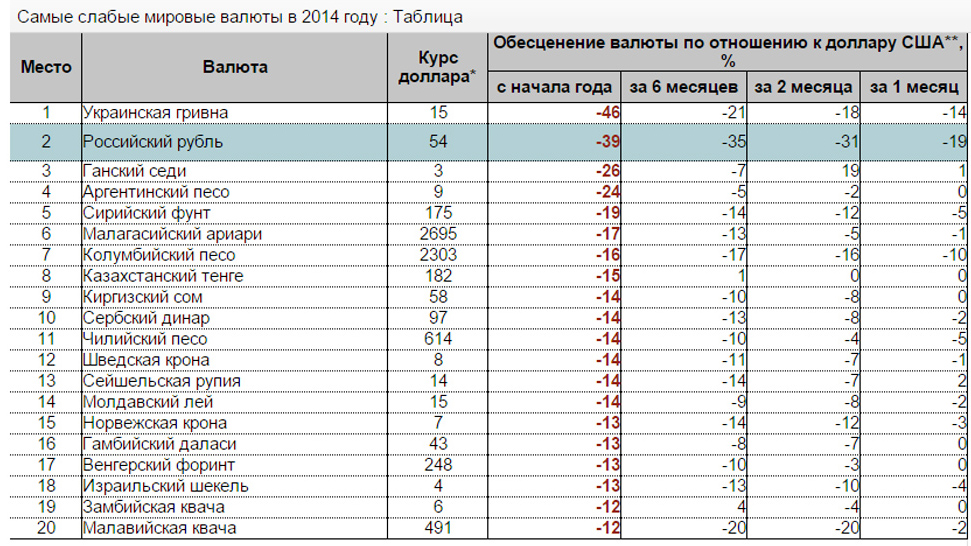 Сообщается, что по темпам девальвации российская валюта уступила только гривне. С начала этого года в долларовом выражении рубль потерял почти 40 процентов своей стоимости, тогда как украинская валюта - 46 процентов.
