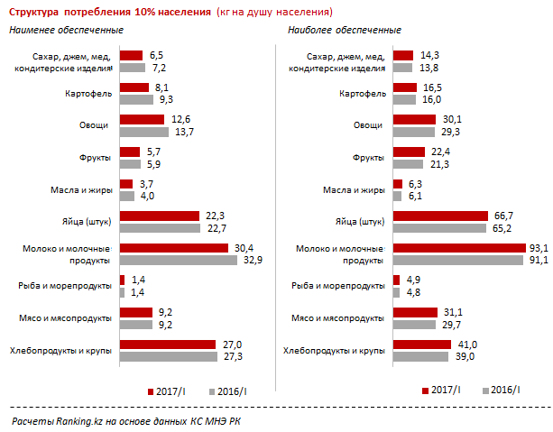 В целом, разрыв в качестве жизни между бедными и богатыми казахстанцами по потреблению продуктов питания увеличивается.