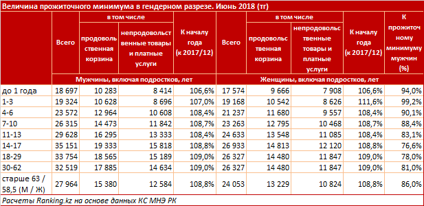 Наибольший разрыв между уровнем прожиточного минимума для женщин и мужчин приходится на подростковый возраст. К примеру, девочкам 14-17 лет полагается сразу на 23,4 процента меньше продовольствия и непродовольственной части минимума, чем мальчикам.