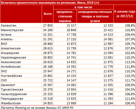 Среди регионов наибольшая величина прожиточного минимума в Мангистауской области - 34,27 тысячи тенге, рост с начала года на 10,8 процента. Далее идет Астана - 32,25 тысячи тенге, рост с начала года на 9,4 процента. В тройке лидеров Алматы - 31,29 тысячи тенге (рост на 7,9 процента).