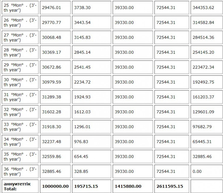 Яғни, кестеге сүйенсек, аннуитет төлемде бастапқыда қарыздың пайызы өтеледі де, соңында ғана қарыздың өзі төленеді.