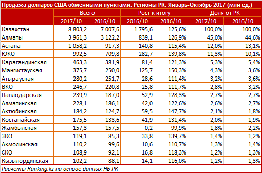 Почти все регионы РК увеличили объем продаж долларов по сравнению с прошлым годом, кроме Жамбылской области.