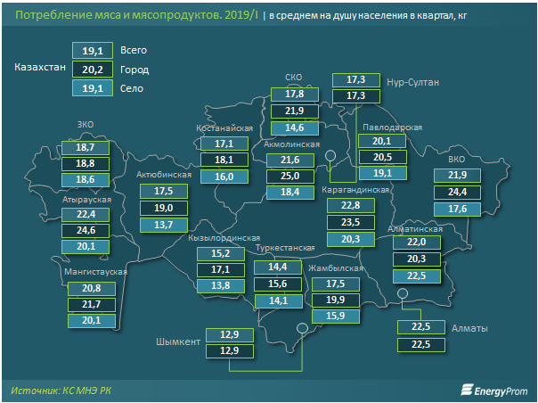 Больше всего мяса едят в Карагандинской области: 22,8 килограмма за квартал на каждого человека. На втором месте Алматы: 22,5 килограмма, на третьем - Атырауская область: 22,4 килограмма.