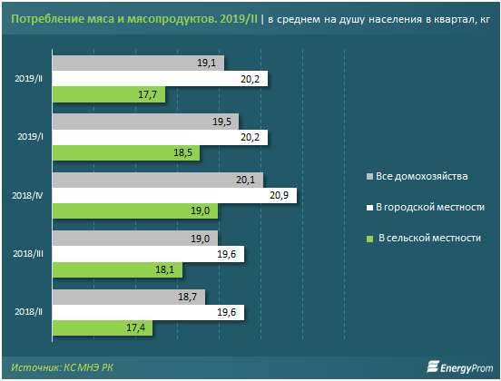 При этом аналитики подсчитали, что потребление мяса и мясопродуктов за последний квартал сократилось на 1,8 процента. За второй квартал 2019 года каждый казахстанец в среднем употребил 19,1 килограмма этого продукта. Самое заметное сокращение было в сельской местности: на 4,5 процента, это 17,7 килограмма на душу населения. А вот городские жители стали есть мяса больше на 0,05 процента, это 20,2 килограмма.