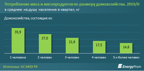 В домохозяйствах, состоящих из одного человека, потребление мяса составило 35,9 килограмма. Отмечается, что чем больше людей в домохозяйстве, тем меньше потребление мяса и мясопродуктов. В домохозяйствах, состоящих из двух человек, за второй квартал употребили 27 килограммов мяса и мясопродуктов на каждого, из трех - 21,6 килограмма, из четырех - 17,5 килограмма, из пяти и более человек - лишь 14,6 килограмма.