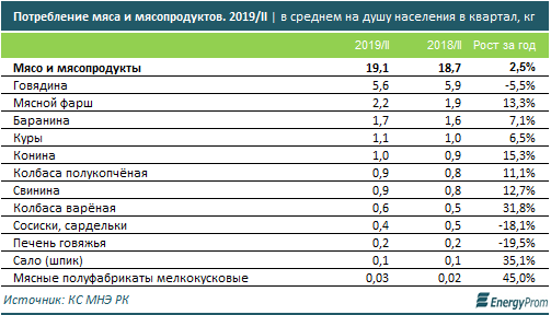 Наибольшей популярностью среди мясных продуктов пользуется говядина: за второй квартал 2019 года каждый казахстанец в среднем употребил 5,6 килограмма. Второе место занимает мясной фарш (2,2 килограмма), замыкает топ-3 самых популярных видов мяса и мясопродуктов баранина (1,7 килограмма).