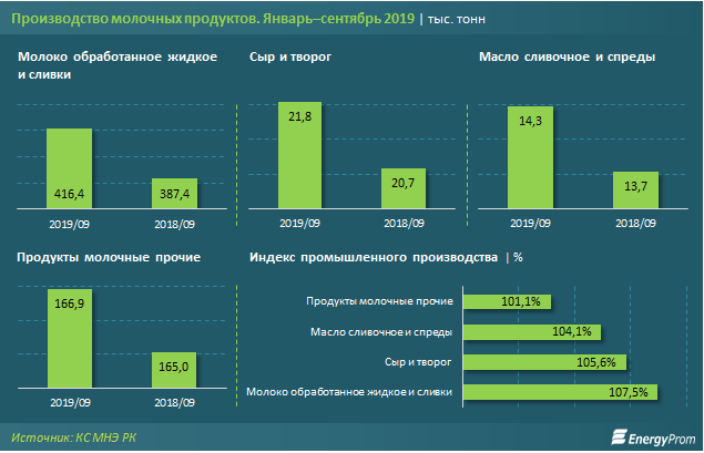 Аналитики портала сообщают, что производство молочных продуктов в Казахстане в январе-сентябре 2019 года выросло до 225,2 миллиарда тенге. Год назад этот показатель составлял 214,3 миллиарда. Индекс промышленного производства второй год подряд составляет 101,8 процента.