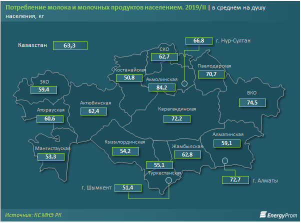 Рост цен на "молочку" сказался на ее потреблении: это наблюдается в 12 из 17 регионов Казахстана. Заметнее всего потребление снизилось в Шымкенте - на 26,1 процента, до 51,4 килограмма (литров). В Мангистауской области молочных продуктов употребляют меньше на 10,9 процента, а в Павлодарской - на 10,5 процента.