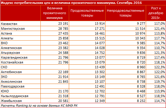 "Самый высокий уровень прожиточного минимума - 28 785 тенге - в Мангиустауской области, с индексом прироста к концу 2015 года в 117 процентов. Далее идут Астана и Алматы со средним прожиточным минимумом в 27 435 тенге и 25 858 тенге, где на Астану приходится индекс роста к итогу 2015 года на 121,4 процента", - привели такие данные аналитики. По их словам, средний уровень прожиточного минимума в Восточно-Казахстанской, Атырауской и Алматинской областях составляет 23 422 тенге.