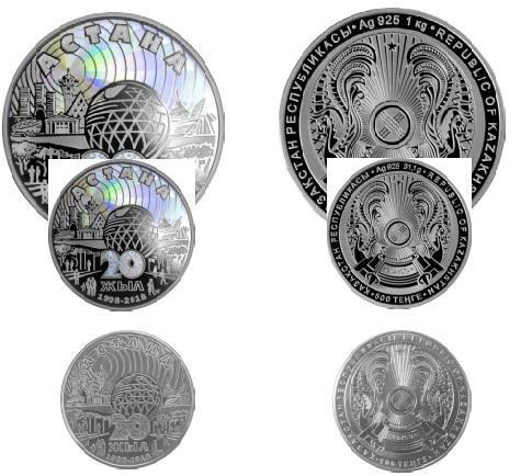 Монеты "Астана 20 жыл" выполнены из серебра - номиналом 5 000 и 500 тенге, и из сплава мельхиор - номиналом 100 тенге. Они имеют идентичные изображения на лицевых и оборотных сторонах.